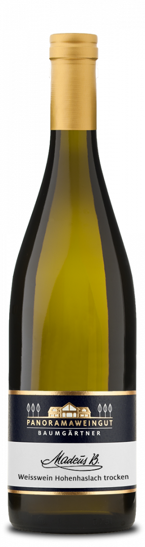 Die Hauptrebsorten im Madeus B. Weisswein sind die Burgunderarten Chardonnay ( 41%) und Grauburgunder ( 18 %). Der Kerner (18%) stammt aus einer alten, ertragsreduzierten Rebanlage. Nach kurzer Kaltmazeration an der Maische legen wir den Wein schon während der Gärung ins 500 l Holzfass. Dort entwickelt er neben den fruchtigen Aromen der Trauben auch cremige und würzige Aromen, die sich perfekt ergänzen. Der rassige Riesling (23%) aus der Höhenlage verleiht dem Cuvée die nötige Säure und Mineralität.