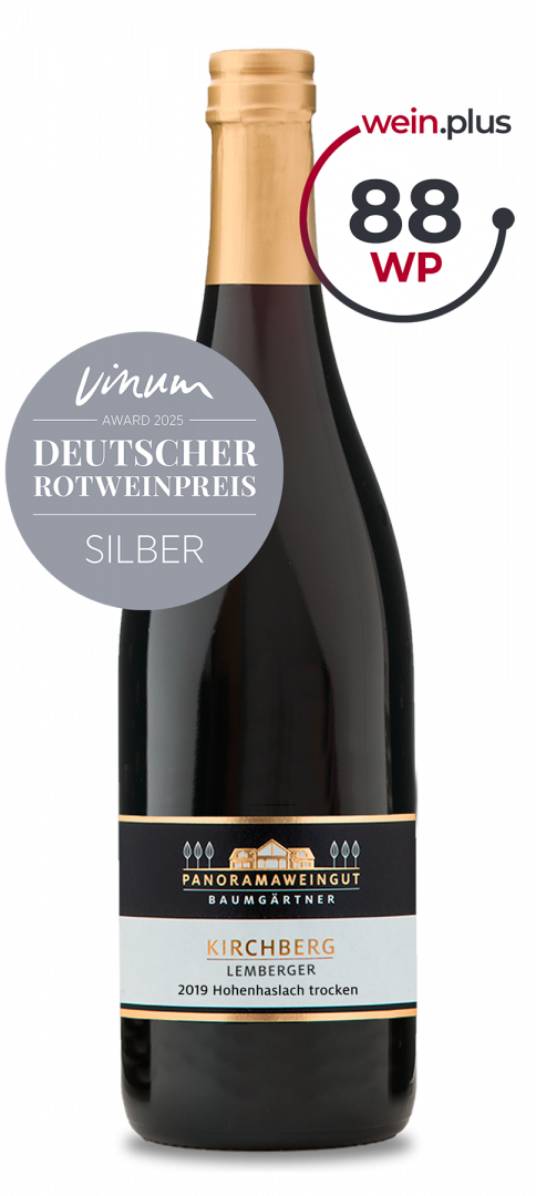 Auszeichnung: Der 2019er Kirchberg Lemberger wurde von Wein Plus mit 88 Punkten ausgezeichnet. Außerdem erhilt er beim Vinum Rotweinpreis 86 Punkte, eine Silbermedaille.